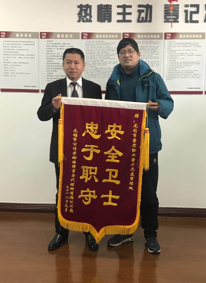 2018年1月10日上午,崇实物业公司三位秩序队员同志勇抓小偷事迹传遍了整个大厦,大家纷纷为他们点赞,都说咱们大厦就是“平安大厦”, 无锡公佳劳务派遣公司老总亲自送来,一面锦旗到物业服务中心,为我司能培养出这样尽职、勇敢的员工表示感谢。